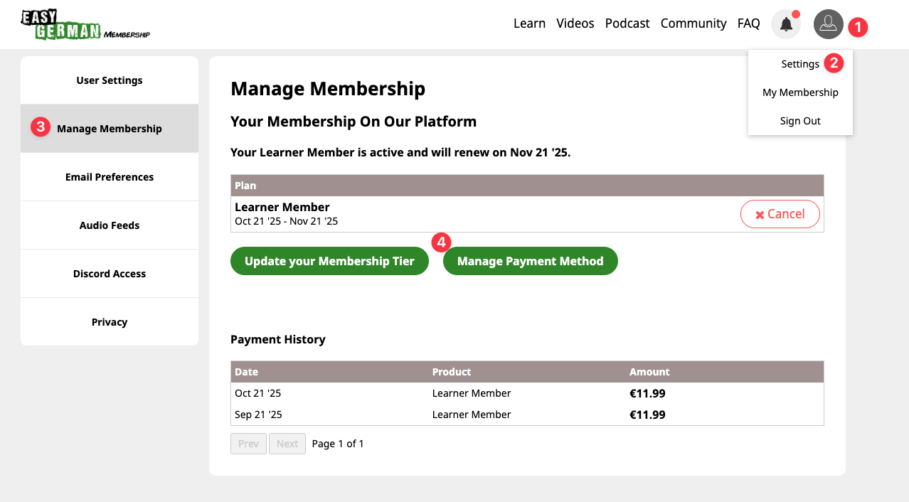 - في اللوحة الموجودة على اليسار، انقر فوق "إدارة العضوية"